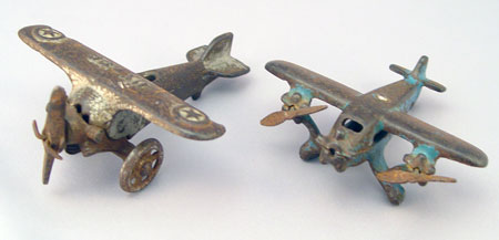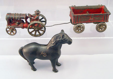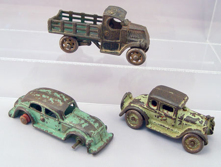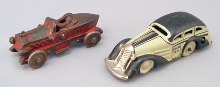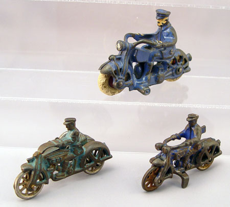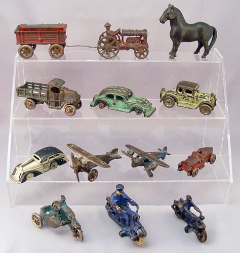 LOT OF 13 VINTAGE TOY CARS, TRUCKS, PLANES, MOTORCYCLES: To include Motorcycle cop 3 1/4'' tall x 4 3/4'' long, white rubber tires; Motorcycle cop marked ''COP'' on side 2 1/2'' tall x 3 3/4 long; Motorcycle cop with sidecar marked ''COP'' on side 2 1/2'' tall x 3 3/4'' long; 4 assorted cast iron cars / trucks, note 1 missing wheels; Tractor & wagon, tractor measures 2 1/2'' high x 3 3/4'' long; A. C. Williams UX 99 plane 2'' high 4 1/2'' long; Plane 1 1/2'' high x 3 1/2'' long; Horse bank 4'' high x 5'' long. All the above are cast iron. Also included is a pressed steel Marx Ticky Taxi 1 1/2'' high x 4 3/4'' long. Please note condition on all.