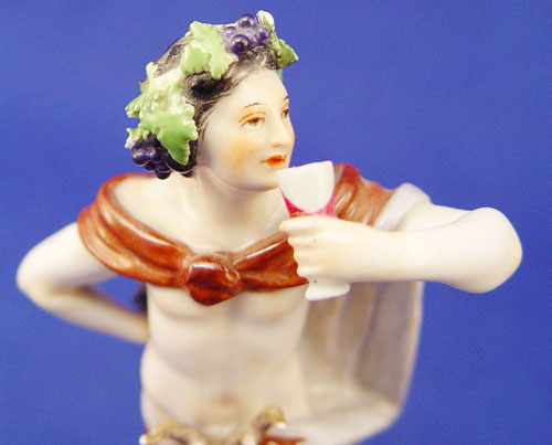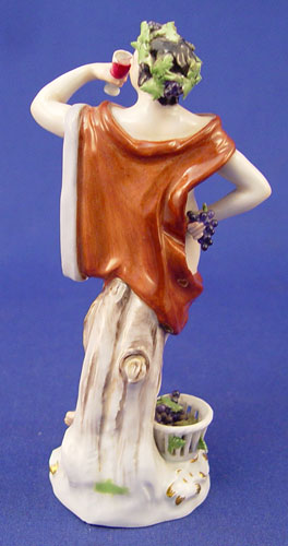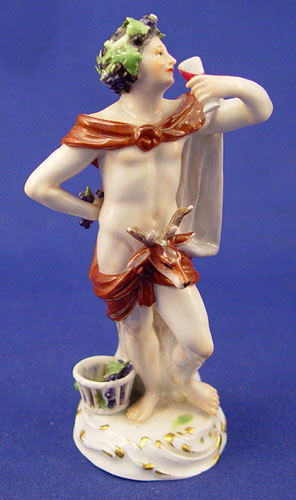 MEISSEN PORCELAIN FIGURE OF BACCHUS: Crowned in grapes, wearing a stag head loin cloth. 5 1/2'' high. Blue cross swords under glaze, incised 1696.