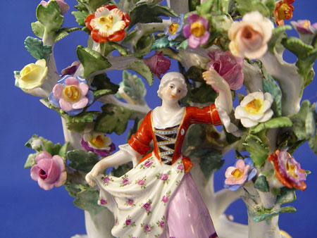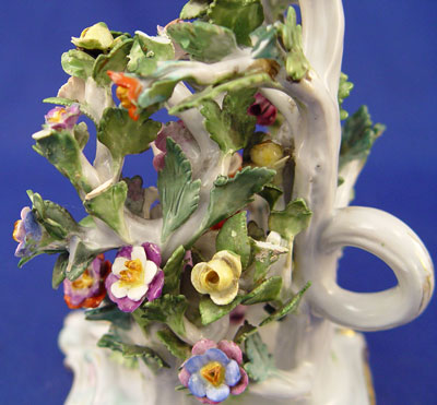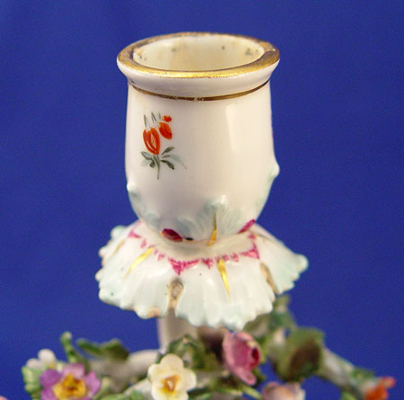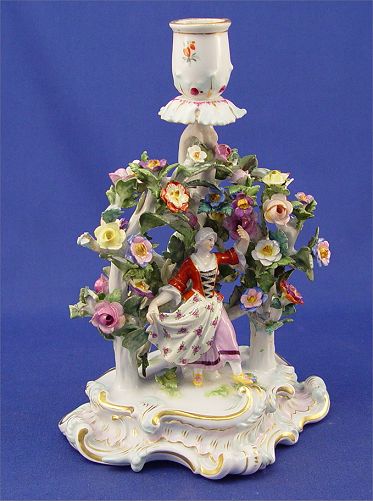 MEISSEN PORCELAIN FLORAL ENCRUSTED FIGURAL CANDLE HOLDER: Delicate figure enveloped under a arch of flowers. Acanthus scroll base, 8 1/2'' high. Blue cross swords under glaze. Please note minute flea bites.