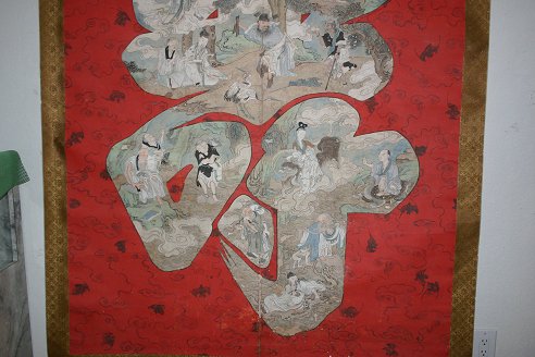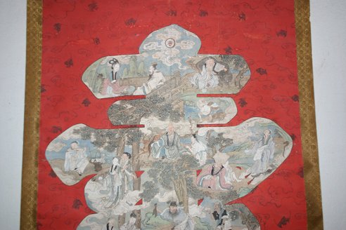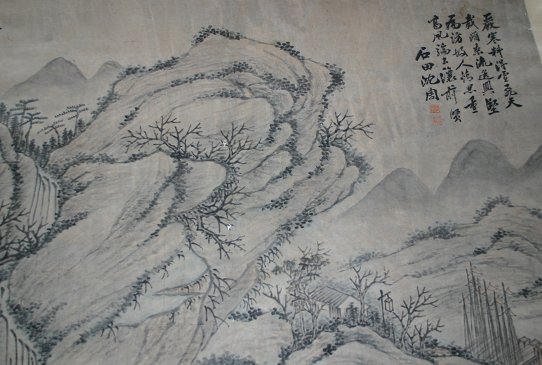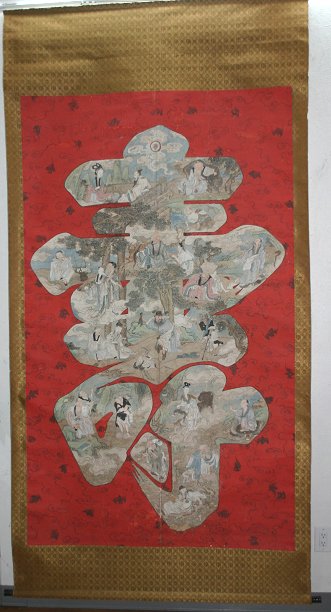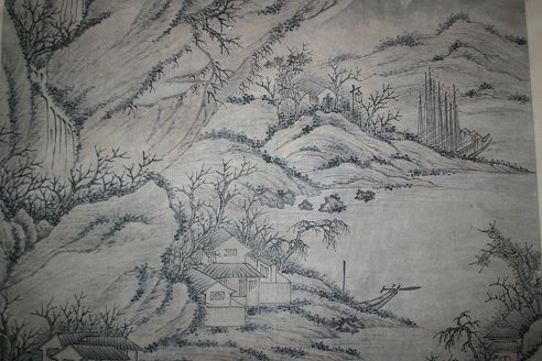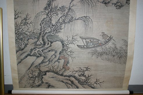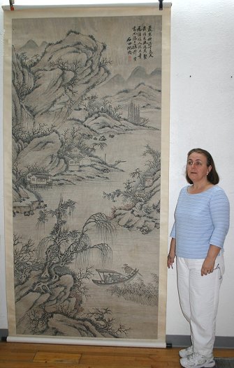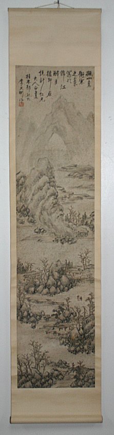 3 SCROLLS: a) 62'' X 13 3/4'' full size, 48 1/2'' X 11'' image size landscape with figures b) 109'' X 55'' full size, 83'' X 49'' image size large SO Character c) 107'' X 47'' image size landscape with figures. Sold as a lot, as is.