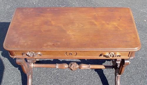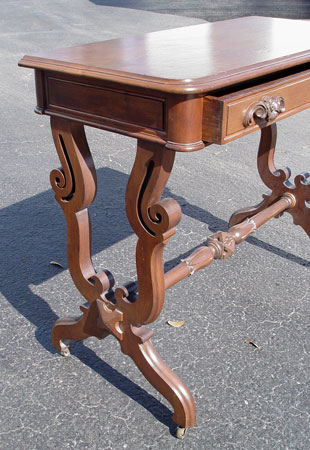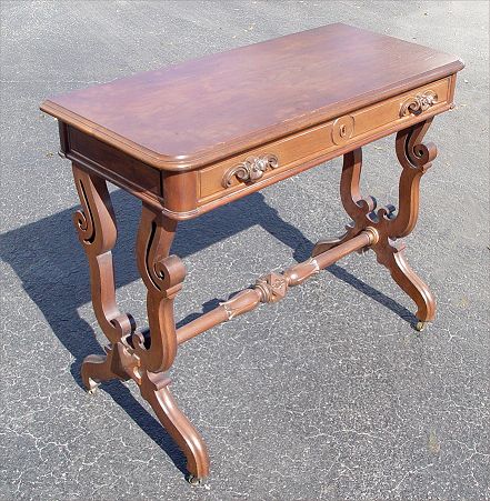 WALNUT VICTORIAN FOYER OR HALL TABLE: Writing table with full length single drawer with carved pulls, carved stretcher, 31 1/4''h. x 37'' x 17'' deep.