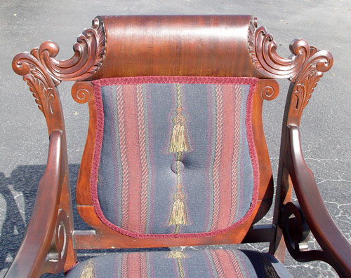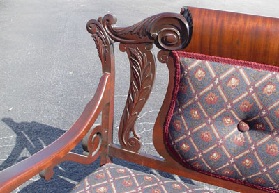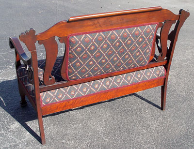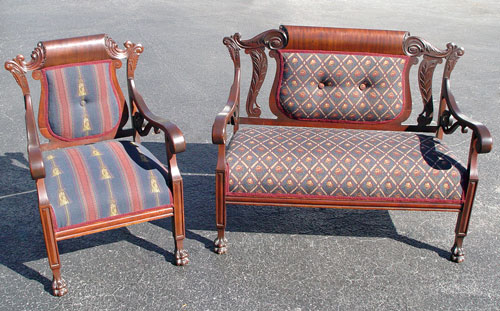 2 PIECE CARVED MAHOGANY VICTORIAN PARLOR SUITE: Settee and arm chair, each carved a bit different, with complimentary upholstery. All in very good condition. Settee is 36''h., 46''l., 20'' deep. Chair is 36''h. x 24''w. x 18 1/2''deep.