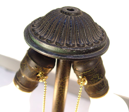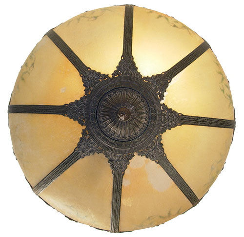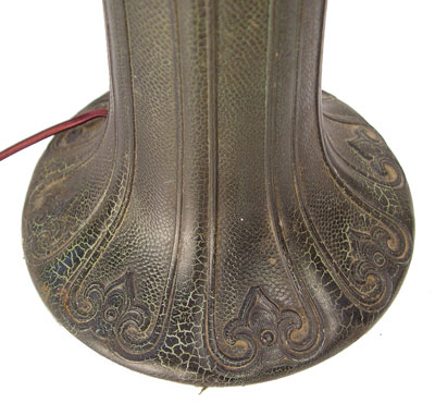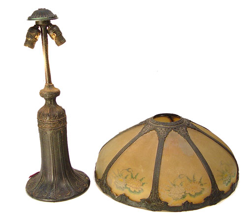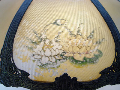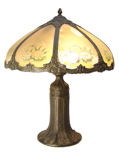 VINTAGE REVERSE PAINTED TABLE LAMP: 8 panel ribbed glass shade painted in flowers. Original alligator finish on metal base and shade. Please note the paint is flaking on the shade. Lamp is 24''h. shade is 19'' dia.