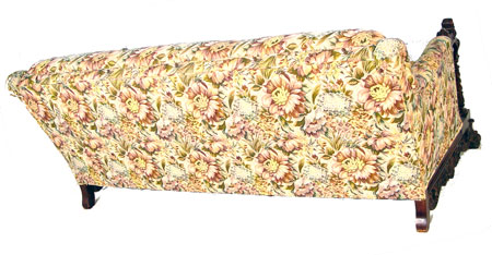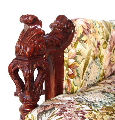 JACOBEAN STYLE EARLY 20TH C CARVED SOFA: Ornately carved skirt, 4 paw feet across the front, carved arm supports and hand holds. Scrolled back, three cushions, all upholstered in floral tapestry type fabric. 74'' long x 34''h. x 39'' deep.