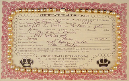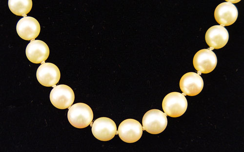 20'' STRAND OF CREAMY GOLD CULTURED PEARLS: 7.50-8.00 mm cultured pearls, gold in color, slightly blemished, medium luster, strung with a dozen 14k yellow gold rondelles. 14k yellow gold findings with lobster claw clasp. Sold with original purchase certificate from Honolulu in 1988.