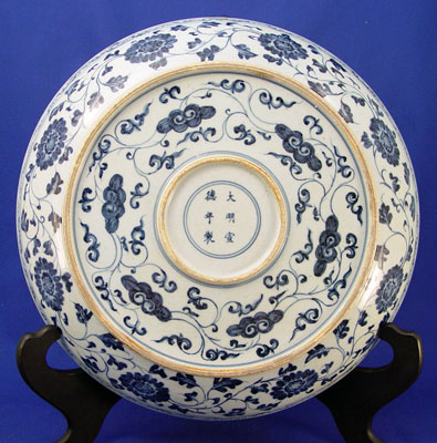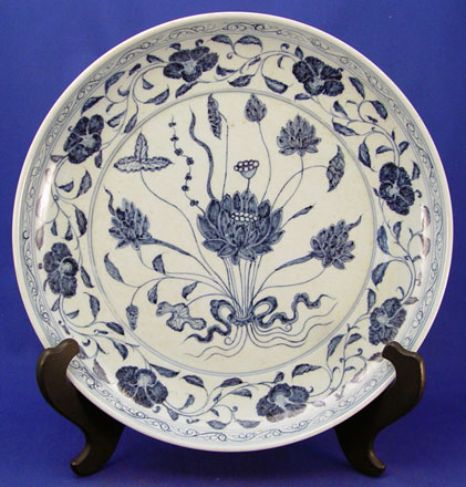 MID 19TH C. CHINESE BLUE AND WHITE LOTUS DESIGN CHARGER: 14'' dia., signed in characters. Est. $400/600**