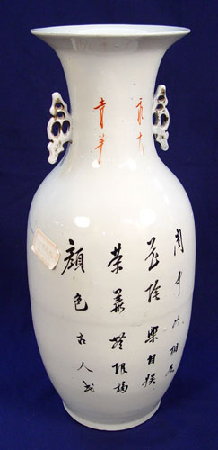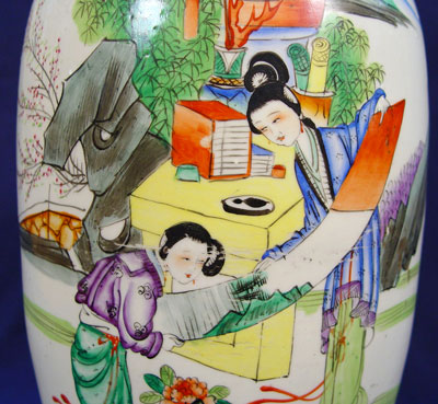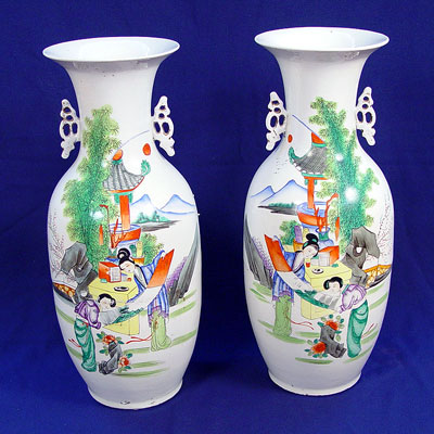PAIR HAND PAINTED POLYCHROME CHINESE VASES: Bright color mirror image of landscape with figures in the foreground. Story or poem told in characters. 22 1/2'' high x 7 5/8'' diameter at top.