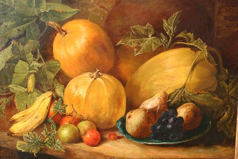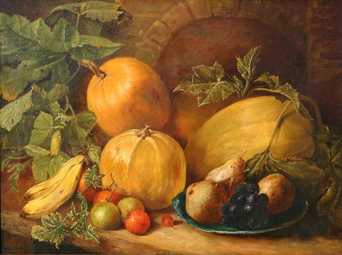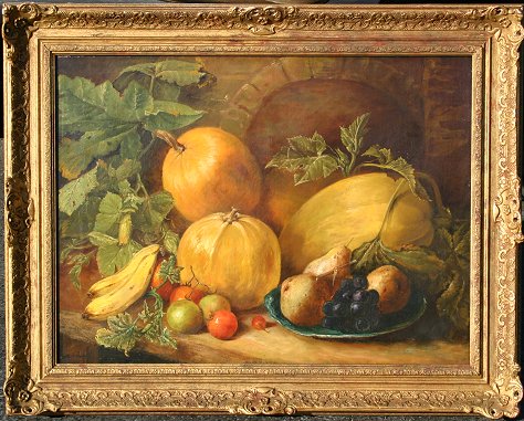 EXCEPTIONAL 19TH C ENGLISH STILL LIFE OF PUMPKINS, MELONS AND FRUIT: O/C, 18'' x 24'', classically styled frame 23'' x 29'', no visible signature. Has been re-lined, several minor flecks, scattered in-paint.
