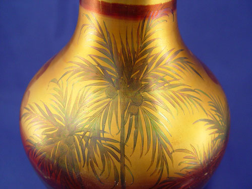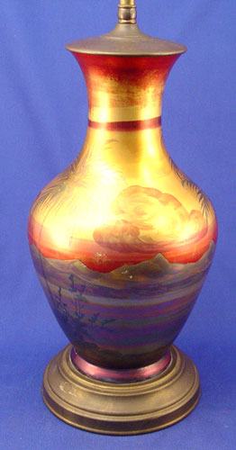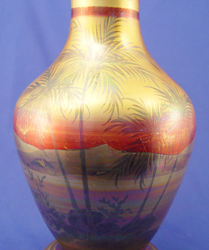 WELLER ''LASA'' ART POTTERY PALM TREE LAMP: Landscape with palm tree motif. Pottery is 12 1/2'' high, lamp is 24'' overall. Double sockets, pull chains. Unsigned, minor glaze loss.