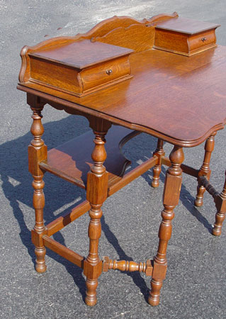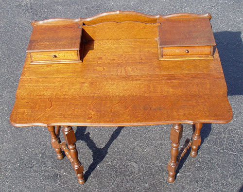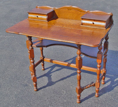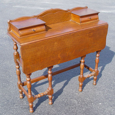 LIMBERT ARTS & CRAFTS GOLDEN OAK DESK: Unusual drop leaf desk. Shaped backsplash, letter slot between two drawers. The swing legs support the leaf to extend the writing surface. Open lower tier. 34 1/2'' h. x 36''w, x 12 1/4'' deep. Unsigned. Est. $750/900**