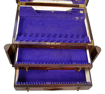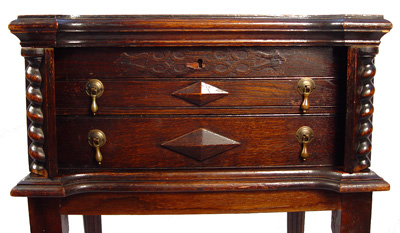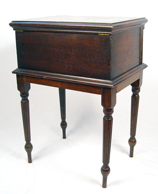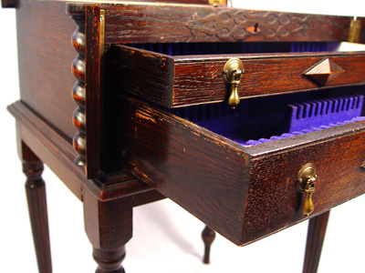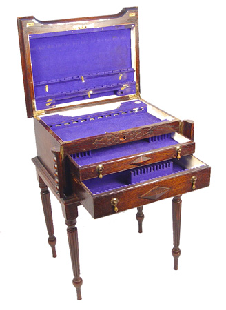 19TH CENTURY ENGLISH OAK SILVER CHEST ON STAND: Lift top exposes felt lined silver box, side corners flip open to allow drawers to open. Reeded legs. 27 1/2''h. x 19'' x 15''.