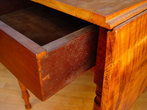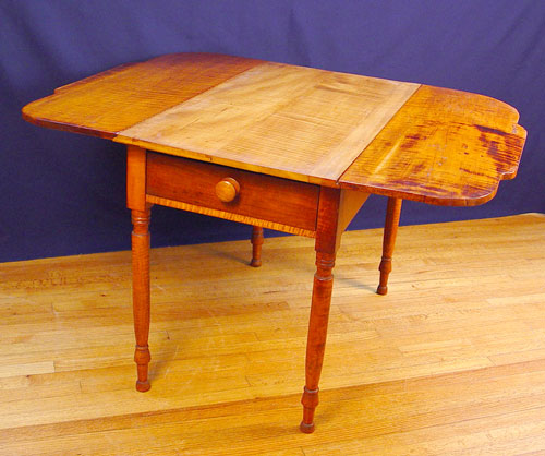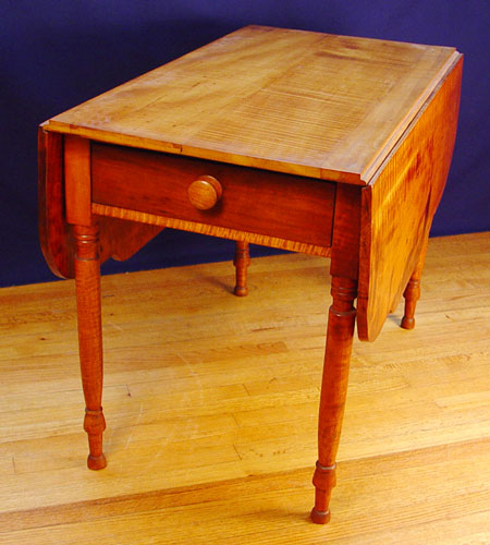 19th C AMERICAN COUNTRY TIGER MAPLE DROP-LEAF TABLE. Single drawer, shaped leaves. The table is 28 1/2'' h. x 40''. With the leaves down, the width is 22 1/2 in., and with the leaves open the table is 49 1/2 in. Beautiful highly grained patterns and coloration.
