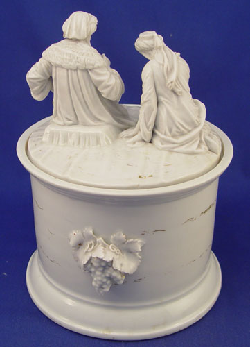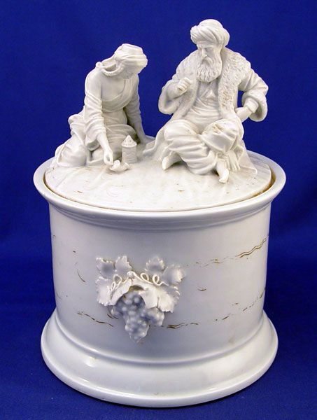 19TH C. PARIAN FIGURAL TOBACCO JAR: Arabic figures on the cover, applied grape on the body. Please note wear to the gold and loss of the pipe handle. 10''h., 7 1/4'' dia.