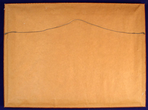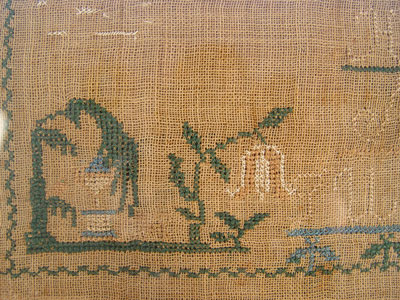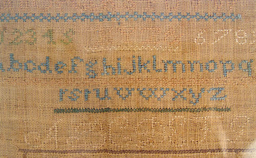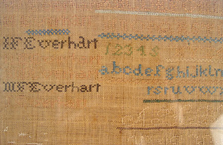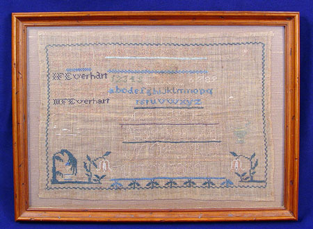 HAND SEWN ''EVERHART'' SAMPLER: Alphabet and numerals, along with listing of seven Everharts. Framed in a much later frame under glass. 22 1/2'' x 16 1/2'' overall, the cloth is 11 1/4'' x 16'' image size. Green, blue, and brown threads held their color. The tan is quite faded.