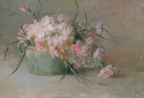 STILL LIFE OF CARNATIONS, CIRCA 1900: Oil/Panel, 9'' x 13'', no visible signature, painted frame with wear, 13'' x 17''. Several minute paint flecks. Est. $300/500**