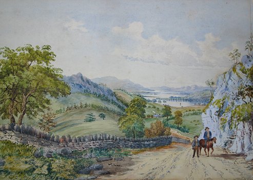 19TH C. ENGLISH W/C LANDSCAPE WITH FIGURES: Image size is 10'' x 14'', quarter sawn oak frame, 20'' x 24''. Faint spotting in sky, hole in mat in upper margin.