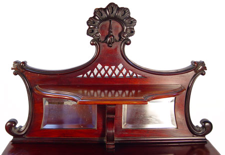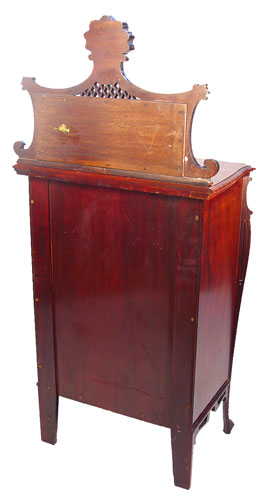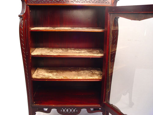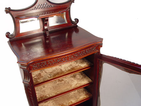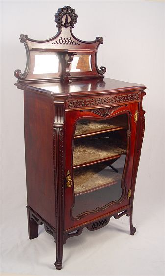MAHOGANY EDWARDIAN MUSIC CABINET, CA 1890: Single glass door shields three velvet lined shelves, carved and shaped backsplash with beveled mirror and shelf, 52'' x 23 1/2'' x 16''. Est. $900/1100**