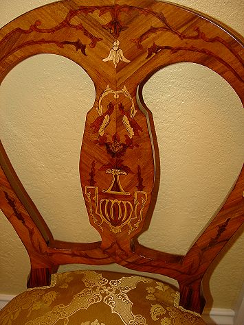 PAIR OF ITALIAN STYLE SIDE CHAIRS: Open harp back with faux inlaid design and stencil accents, gold upholstered seats, 39 1/2''h. Late 20th C. c