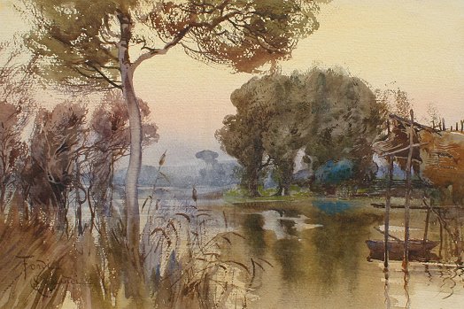 CARLANDI, Onorato, (Italian, 1848-1939): Serene river scene, W/C, sight size 13 3/4'' x 20 3/4'', signed, titled Fondi, matted and framed 20'' x 27''. Faint abrasion noted.