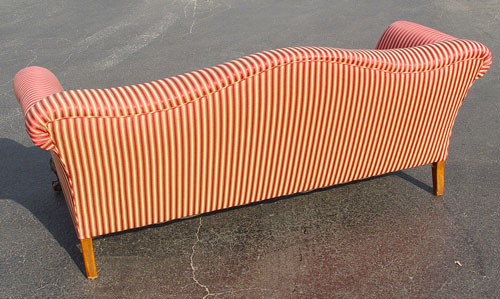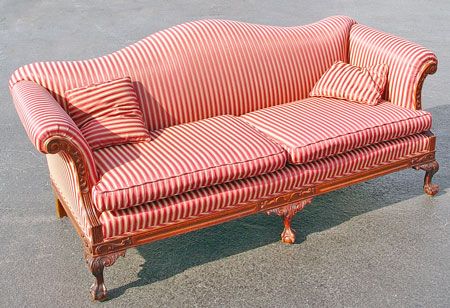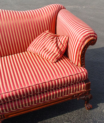 CHIPPENDALE STYLE CAMEL BACK SOFA: Carved mahogany ball and claw feet (three across front) and ornately carved trim. Rolled arms. Double cushion sofa with striped satin upholstery and matching down throw pillows. Approx. 78'' x 34''.