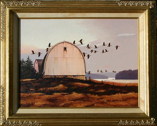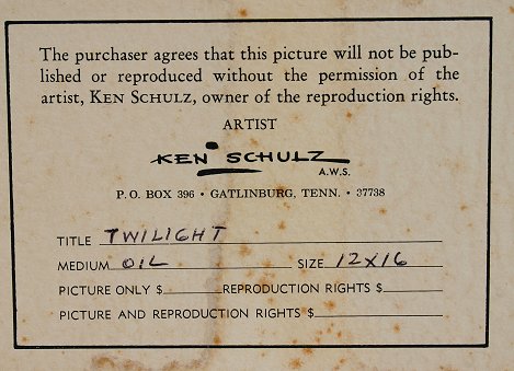 SCHULZ, Ken, (American, 1920-2006): ''Twilight'', Oil/C, 12'' x 16'', signed and dated 81, encased in original frame, 16 1/2'' x 20 1/2'', original artist label verso. Some separation of canvas from board lower margin. Est. $500/800**