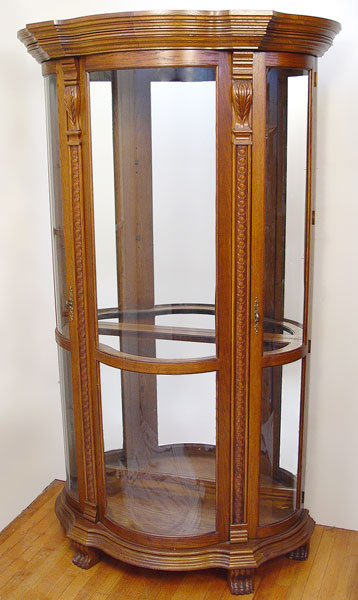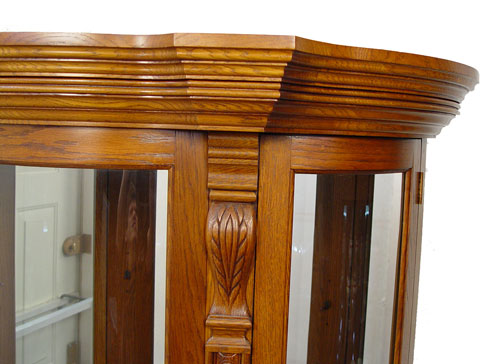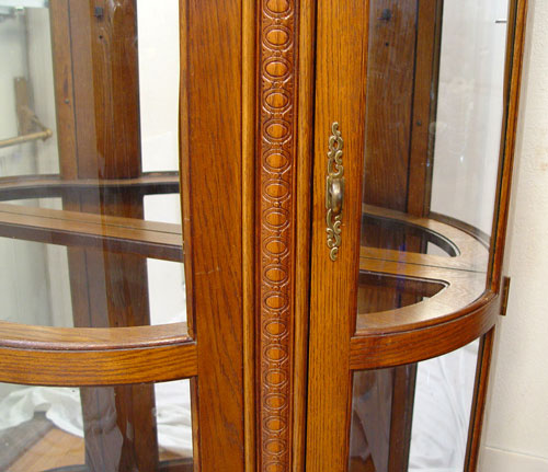 TRIPLE BOW OAK DISPLAY CABINET: Made in USA, Philip Reinisch Co. Chicago Il., opens on sides, 80 1/2'' high x 42'' wide x 20'' deep