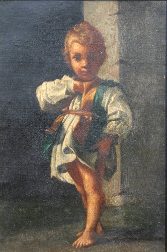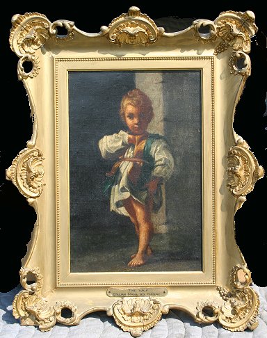 19TH C. ITALIAN SCHOOL OIL/C ''THE WAIF'': 12'' x 8'', no visible signature, period pierced carved gesso frame with wear and repair. Painting needs cleaning.