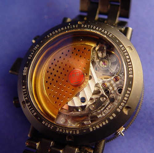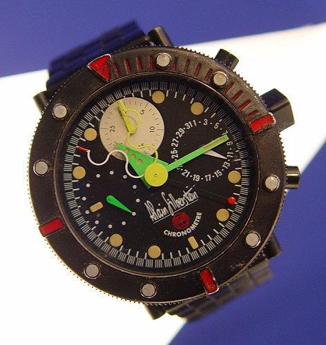 ALAIN SILBERSTEIN KRONOMARINE RATTRAPANTE CHRONOGRAPH WRIST WATCH: Black metal case Alain Silberstein Chronometre wrist watch. Automatic movement, Sapphire crystal, black dial with painted illuminated markers. 3 subsidiary dials. One crown cap is missing, water proof to 200 meters if replaced. Authorized service company for the United States is STOLL & Co. Ms Karen Evans kevans@americaswatchmaker.com 1801 South Metro Parkway Dayton, OH 45459 800-786-5526. Attached black link bracelet with flip lock closure. All clocks and watches are sold as is, due to their delicate nature, even though they may be working just fine.