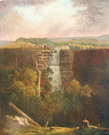 19TH C. AMERICAN SCHOOL OIL/C PORTAGE FALLS GENESSE RIVER: 20 3/4'' x 16 3/4'', possible monogram lower left, unframed. Unusual restoration placed the original canvas on thin metal sheet and then attached to canvas, several repairs to punctures.