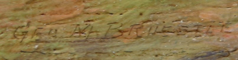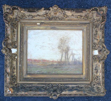 BRUESTLE, George, (American, 1872-1939): Tonalist Landscape, Oil/Wood Panel, 8'' x 10'', signed, pierce carved frame with damage and missing gesso, 15'' x 17''. Needs cleaning.