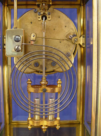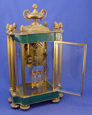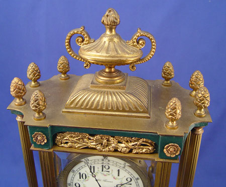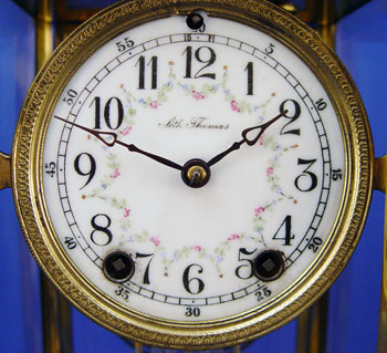 SETH THOMAS CRYSTAL REGULATOR CLOCK: 4 1/2'' Porcelain face marked ''Seth Thomas''. Empire style 4 bronze fluted columns. Pinecone finial and urn top. 16 1/2'' high X 9'' across X 5 1/4'' deep. Note small crack in beveled rear glass only.