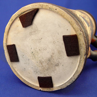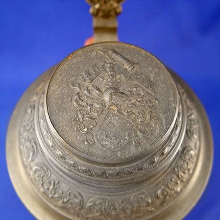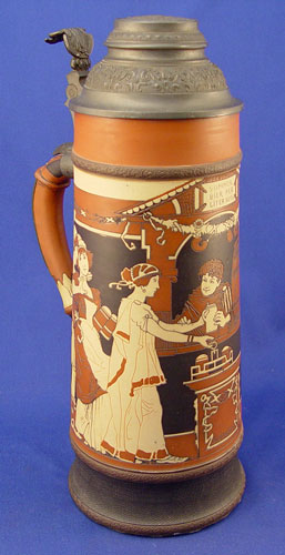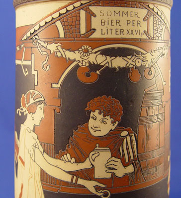 GERMAN METTLACH STEIN 2193: Incised bar scene. Hinged pewter lid with embossed decoration, 14 1/2''h.