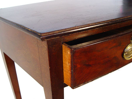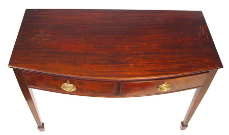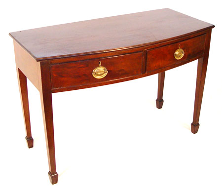 19th C ENGLISH MAHOGANY WRITING TABLE: Bowed front, two drawers, spade feet. 29'' high x 43'' x 20 1/2'' deep.