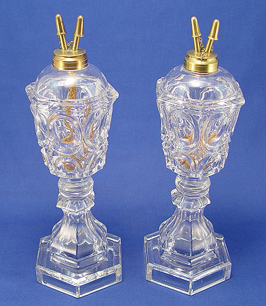 PAIR OF MID 19TH C FLINT GLASS WHALE OIL LAMPS: Matched pair Bulls Eye design, double burners, 10''h.