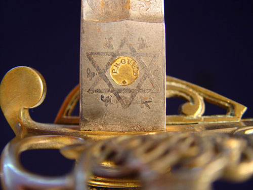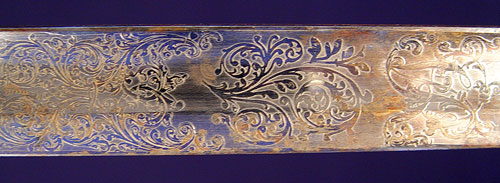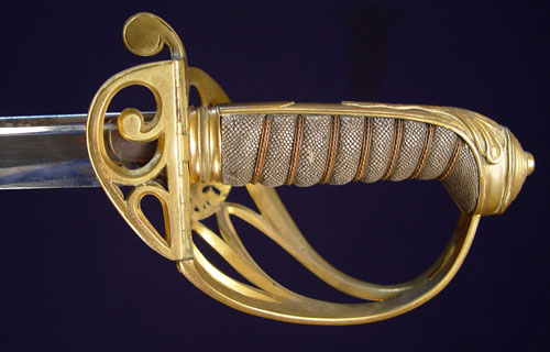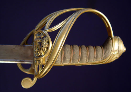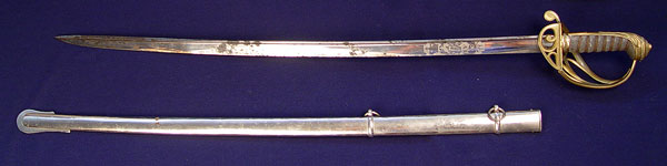 CIVIL WAR ERA BRITISH CAVALRY SWORD & SCABBARD: Ornate brass guard, pommel and backstrap. Original sharkskin wrap and original wire grip. 32'' blade marked in etched panel Lambert Brown & Co. London & Dublin. has minor areas of age staining, balance mirror bright. One chip on blade. Etched British military design in panel on either side. Scabbard is excellent with no dents or dings, one tiny spot of original nickel lose. Dates 1850's-1870's.