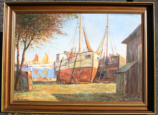 JENSEN, Arup, (Danish, 1906-1956): Harbor Side, Oil/C, 26'' x 37 1/2'', signed, gilded frame with minor wear, 31'' x 43''.