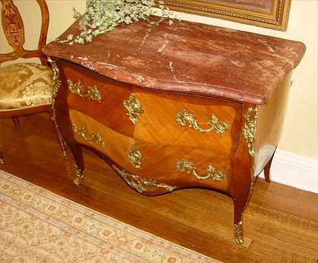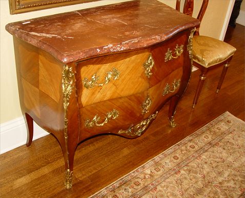 FRENCH MARBLE COMMODE: Red beveled marble top over 2 drawer Bombay case, ormolu mounts, 35 1/4'' high x 42'' x 24'' deep. 20th C.