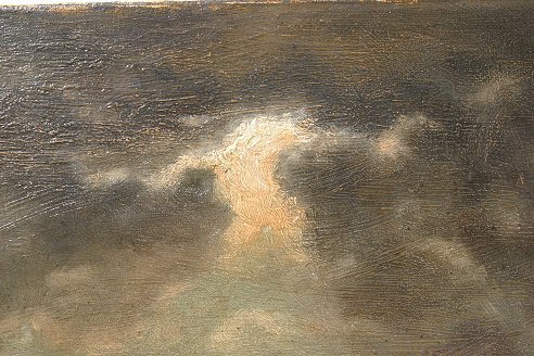 LATE 19TH C NOCTURNAL HARBOR SCENE: Oil/C, 11'' x 8'', no visible signature, encased in a period gilded gesso frame with wear, 16'' x 14''. Needs cleaning, paint fleck in sky needs repair.