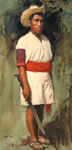 McGRATH, Clarence, (American, 1936): GUATEMALAN WORKER, Oil/B, 48'' x 24'', signed, carved frame, 57'' x 33''.
