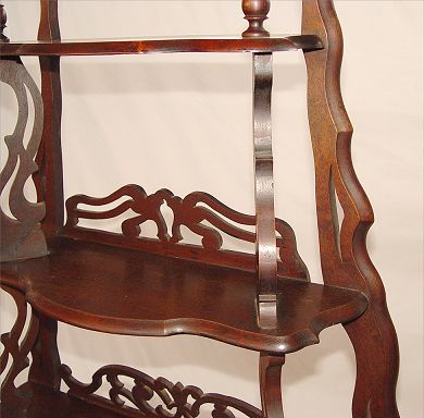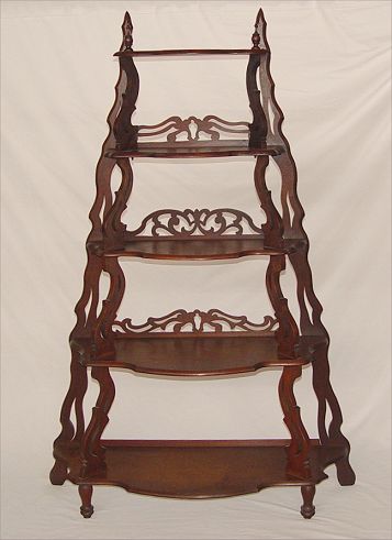 WALNUT 5 TIER VICTORIAN ETAGERE: Graduated shelves, the highest being 18 1/4'' wide, the lower most being 41''w. and 14'' deep. Shaped supports. 61'' high overall.