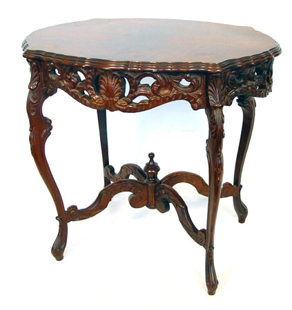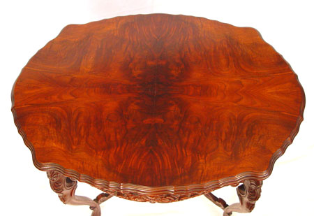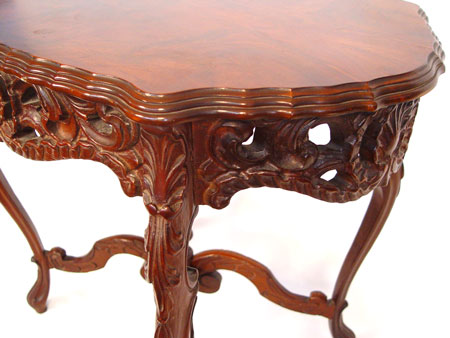 EARLIER 20TH C PIERCE CARVED FLAME GRAIN MAHOGANY SIDE TABLE: Richly grained veneer top with tiered and beveled edges, pierce carved apron, four curved stretchers join at finial. 29''h. x 32'' x 22''.