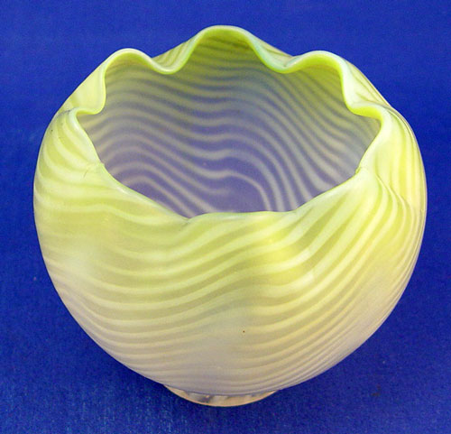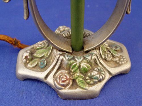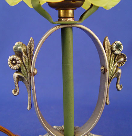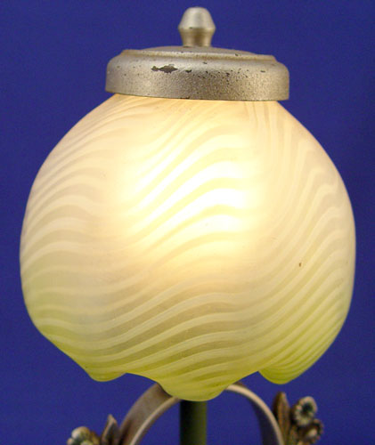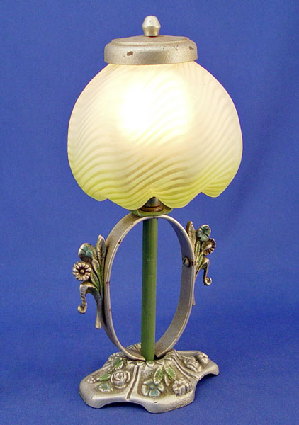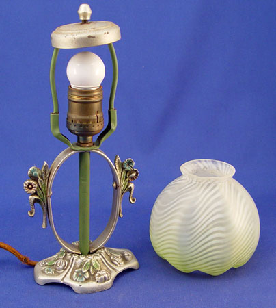 VINTAGE EARLY 20TH C BOUDOIR LAMP WITH ART GLASS SHADE: Painted metal base with original cord, numbered A1501. The art glass shade is free of chips or cracks, with a 2 1/2'' fitter rim. The lamp is 11''h. overall.