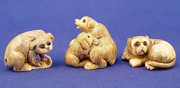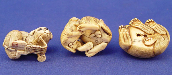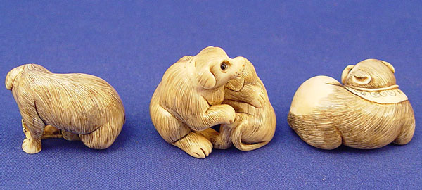 GROUP OF 3 CARVED IVORY NETSUKES: 1) Two male dogs 1 3/8'' high X 1 1/2'' wide. 2) Cat 1'' high X 1 1/2'' wide. 3) Dog playing with rope 1 1/8'' high X 1 3/4'' wide. All are artist signed.