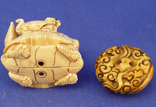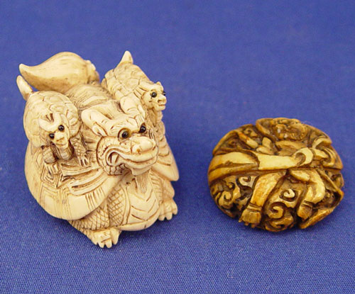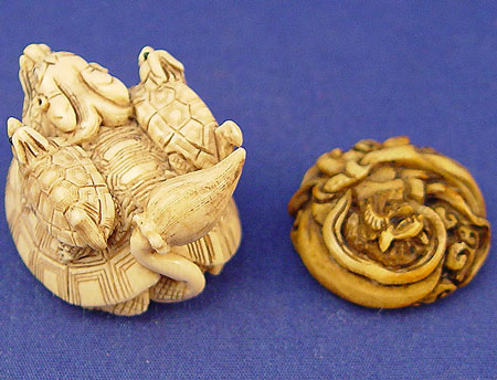 GROUP OF 2 CARVED IVORY NETSUKES: 1) Round demon, 3/8'' high x 1 1/4'' dia. 2) Dragon turtle 1 1/8'' high X 1 3/4'' wide. All signed by artist