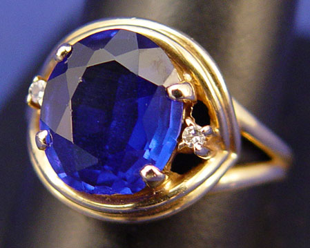 LADY'S FASHION 5CT SAPPHIRE RING: 5.00ct oval shaped mixed cut synthetic sapphire flanked by two .05 CTW round single cut diamonds, rated VS in clarity and H-I in color, set in 14k yellow gold. Size 11, 6.3 grams.