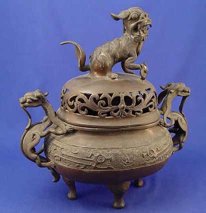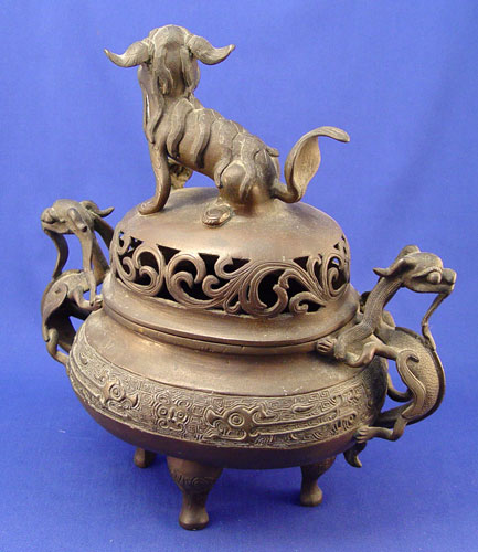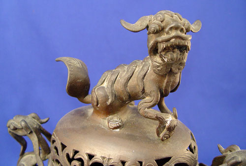 BRONZE FOO LION CENSOR MING DYNASTY: Open work top with figural lion. Foot base with figural dragon handles. Signed with characters on bottom. 13 1/2'' high x 12'' long x 7 1/2'' wide