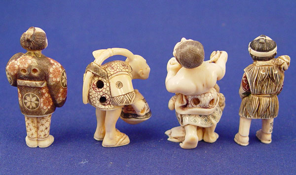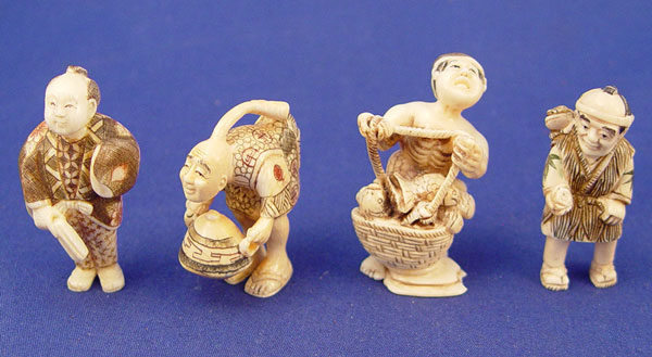GROUP OF 4 CARVED IVORY NETSUKES: 1) Man 2'' high X 3/4'' wide. 2) Man with ornate kimono 2 1/8'' high X 1'' wide. 3) Man with a pot 1 3/4'' high X 1 3/8'' wide. 4) Man with bucket of fish 2 1/8'' high X 1 1/4'' wide. All artist signed.