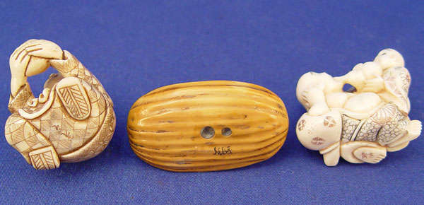 GROUP OF 3 CARVED IVORY NETSUKES: 1) Man laying down drinking from gourd 7/8'' high X 2'' wide. 2) Man drinking from cup 1 1/2'' high X 1 3/8'' wide. 3) Servant helping man drink 1 1/2'' high X 1 1/2'' wide. All artist signed.