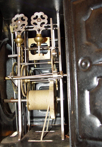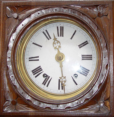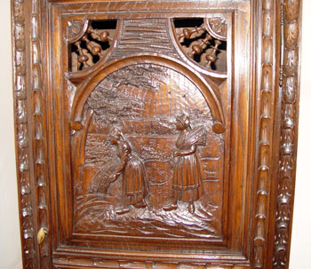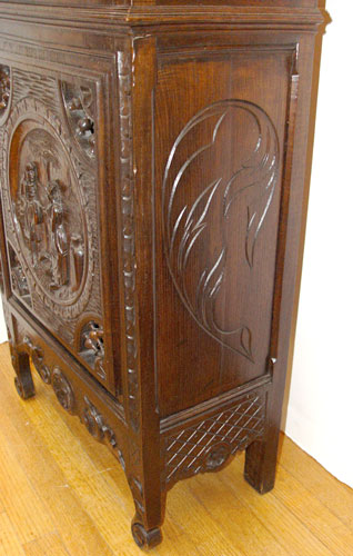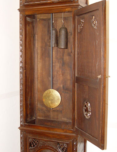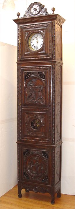 HEAVILY CARVED 19TH C. FRENCH DUTCH TALL CASE CLOCK: Breton clock with carved oak case with figures on the front. Enamel dial, weight driven, gong strike, pendulum included. Approx. 8'4'' tall, x 24 1/2'' x 12''d. Est. $2500/3500**