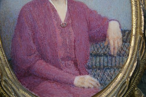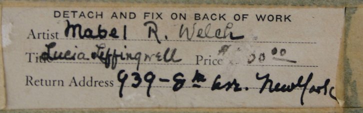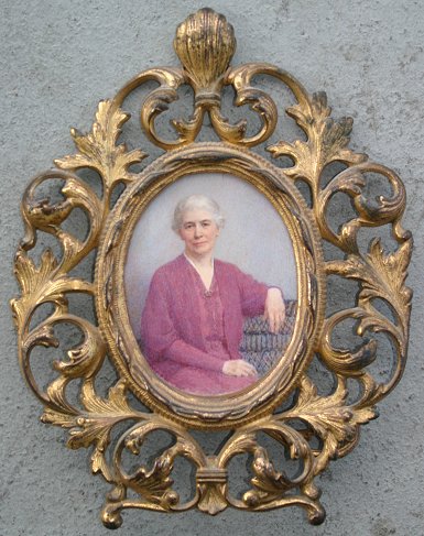 WELCH, Mabel, (American, 1871-1959): PORTRAIT of LUCIA LEFFINGWELL, W/C on Ivory, 5'' x 4'', unsigned, exhibition label affixed verso, encased in gilded bronze foliate motif frame, 11'' x 8 1/2''. 1/4'' crack in ivory upper margin. http://www.askart.com/askart/artist.aspx?artist=79415 for artist's biography.
